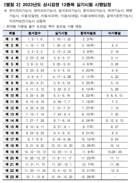 보통 요리분야와 미용분야의 경우 월 2회의 시험으로 상시로 진행됩니다.