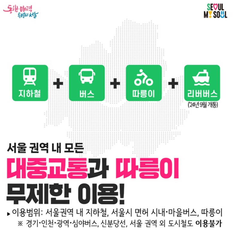 지하철 버스는 물론 따릉이(자전거)와 24년 9월 개통예정인 리버버스도 해당된다고 합니다. 지금 바로 시행되는 것은 아닙니다.