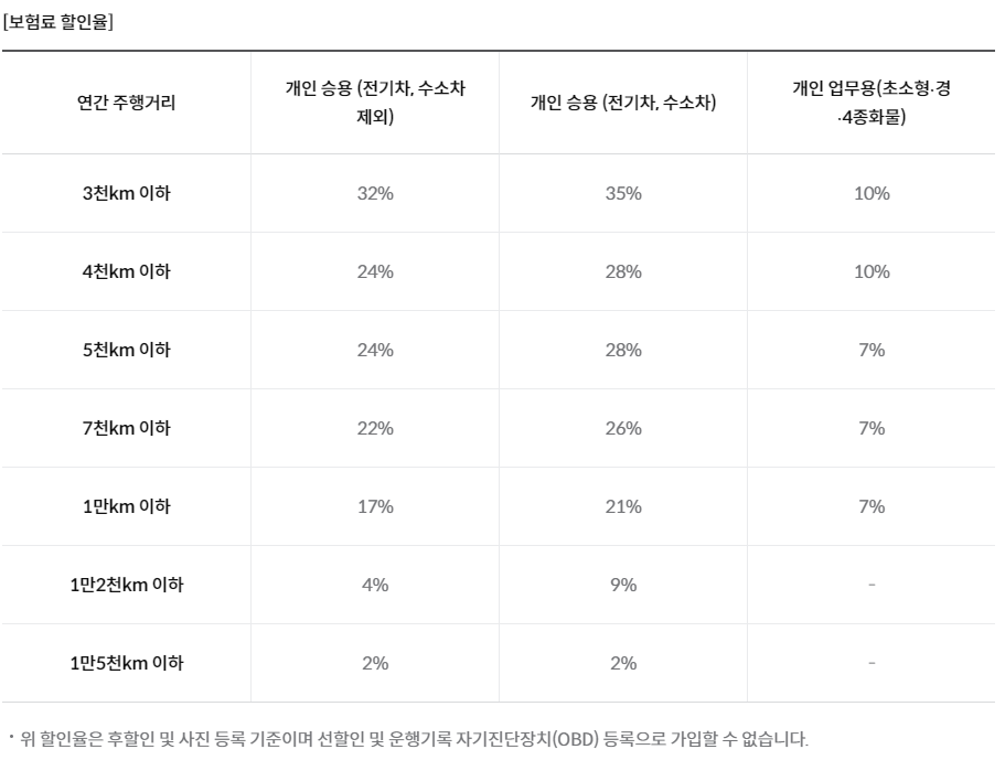 ▶️ 연간 3천~1만 5천 km 이하 운행 시 차종 및 운행 거리에 따라 2~35% 보험료 특약 할인