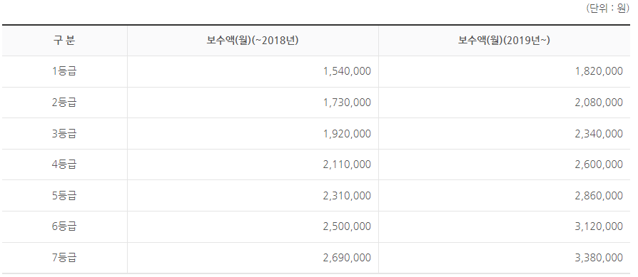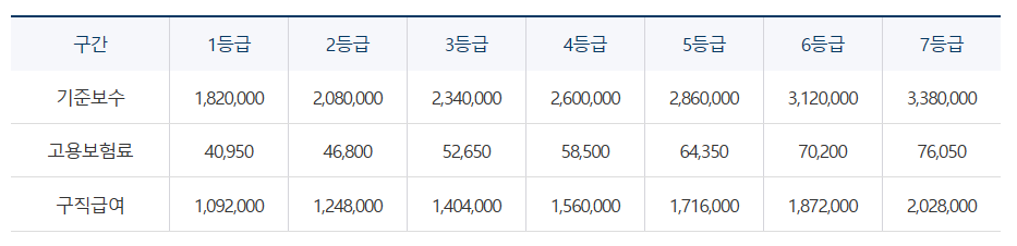 기준보수는 1등급부터 7등급으로 나눠져 있으며 높은 기준보수등급을 선택하면 실업급여액이 높아집니다.