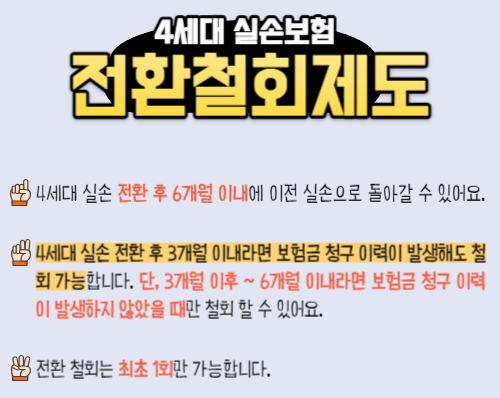 🔹 4세대 실비보험 전환 후 6개월 이내에 보험금 수령이 없다면 4세대 실손보험 계약을 철회하고 이전 실비보험 상품으로 돌아갈 수 있습니다.